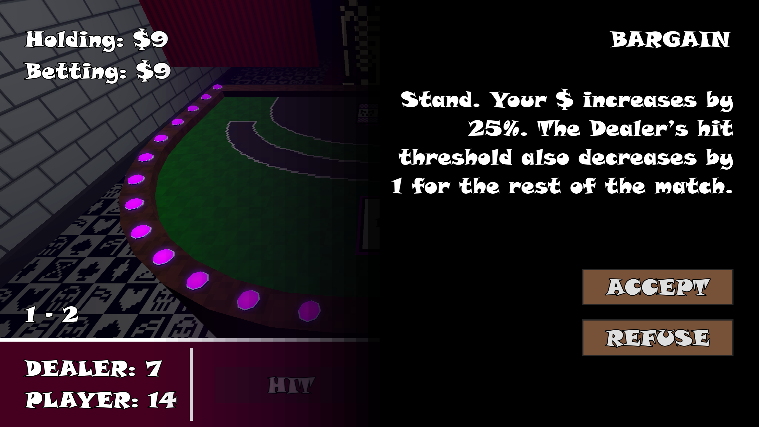 Each one will challenge you to a game of blackjack. These dealers don't play nice; their cards can be cursed and manipulate you with bargains.