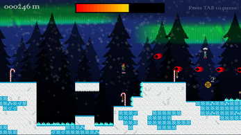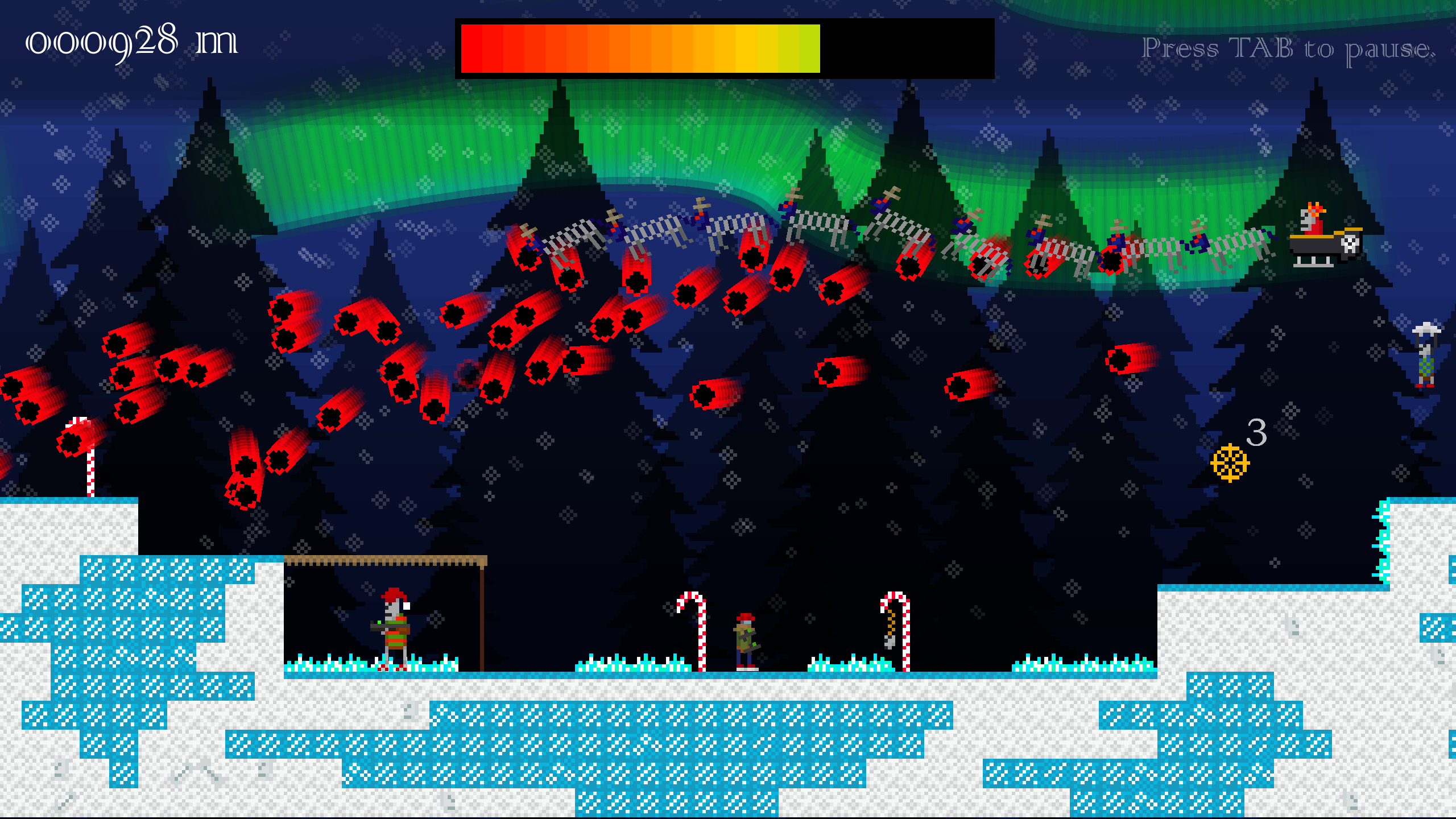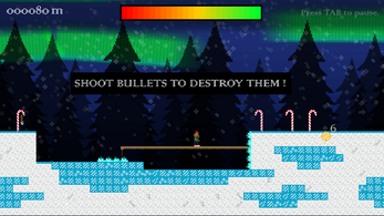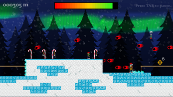 Sk88 is an endless sidescroller. Your only controls are JUMP and SHOOT, using RMB and LMB respectively. Skeleton Elfs, Skeleton Parachutes, and Present Mimics will attack you as you dodge obstacles. You can shoot their bullets to break them, which is the only way to regain health. The game is infinite, but your primary goal is to defeat the Skeletal Sleigh, which appears every 800 m.